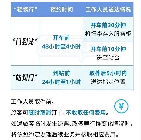 “轻装行”是铁路部门为旅客出行提供的“门到站”“站到门”同城行李搬运服务。在同城距离车站35公里内,旅客根据实际需要可选择以下两种“轻装行”服务: