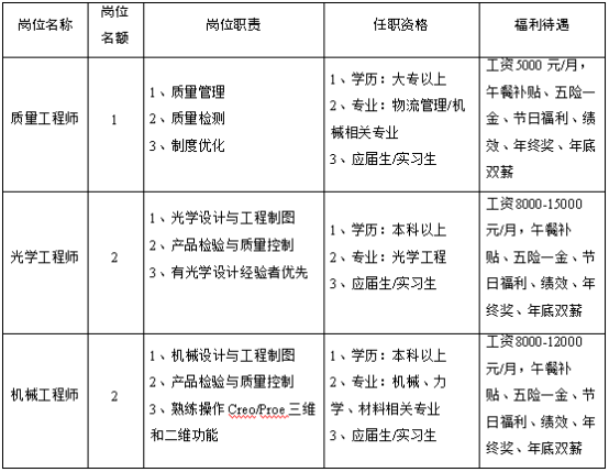 质量工程师:1名 机械工程师:2名 光学工程师:2名