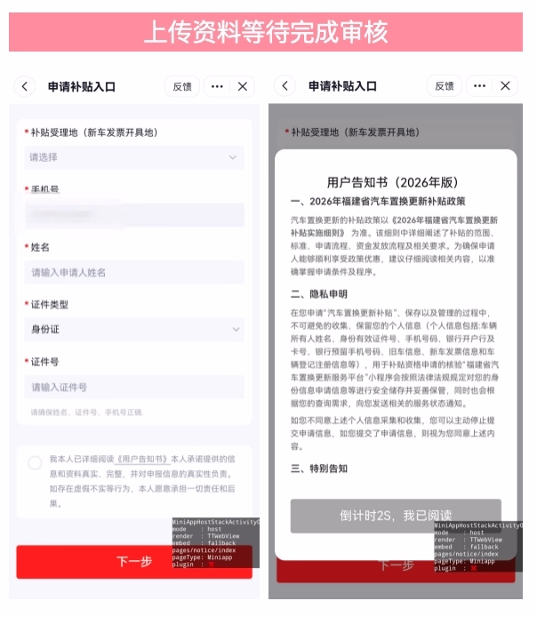 用户勾选用户告知书之后,可点击【下一步】,进入填写申请补贴信息页面。申请补贴信息主要涉及申请人信息、银行卡信息(补贴资金发放所需)、置换更新信息、购置新车信息。