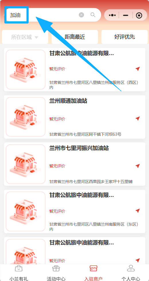 进入“小兰有礼”微信小程序,点击下方菜单栏的“活动商户”,在左上方搜索框搜索“加油”即可查看已入驻活动平台的商户信息!